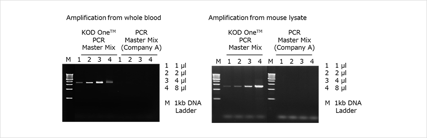 Amplification from whole blood and that from mouse lysate were compared. KOD OneTM PCR Master Mix amplified the targets efficiently.