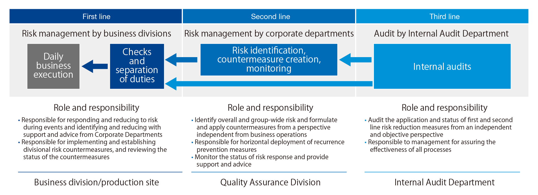The Group has implemented a “three lines of defense” system since FY2022, consisting of three departments: the first line (business divisions/production sites), the second line (Quality Assurance Division), and the third line (Internal Audit Department), creating a multilayered framework to detect and prevent misconduct.
